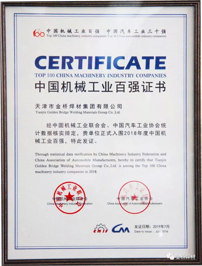 金橋焊材集團(tuán)榮獲2018年中國(guó)機(jī)械工業(yè)百?gòu)?qiáng)企業(yè)稱號(hào)