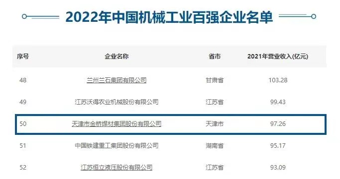 機(jī)械工業(yè)是工業(yè)發(fā)展的“心臟”,也是國民經(jīng)濟(jì)發(fā)展的重要基礎(chǔ)。隨著2022年中國機(jī)械工業(yè)百強(qiáng)的發(fā)布,金橋焊材集團(tuán)成為天津市兩家入圍的企業(yè)之一,位列第50位,連續(xù)多年入圍中國機(jī)械工程百強(qiáng)名單。